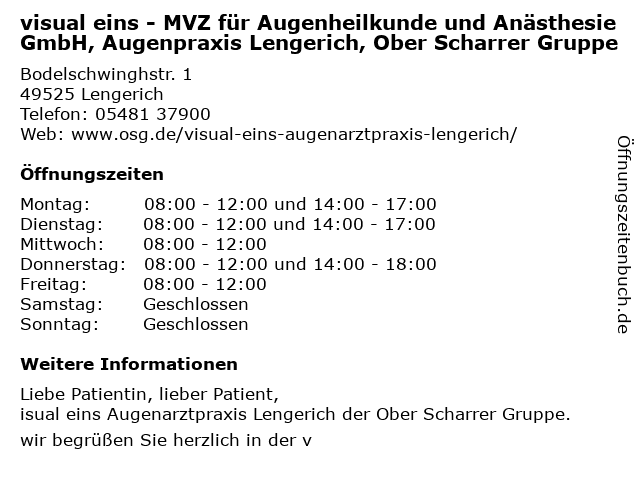 Branchen & Suchbegriffe zu visual eins - MVZ für Augenheilkunde und Anästhesie GmbH, Augenpraxis Lengerich, Ober Scharrer Gruppe:anästhesie, augenheilkunde, augenpraxis, eins, gruppe, mvz, ober, scharrer, visual |