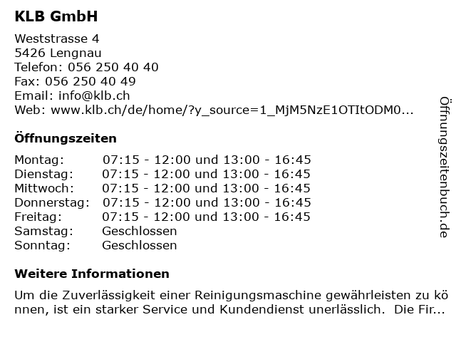 | Öffnungszeiten KLB GmbH in Lengnau anzeigen | |