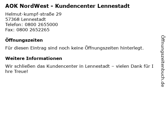 | AOK NordWest - Kundencenter Lennestadt anrufen | |