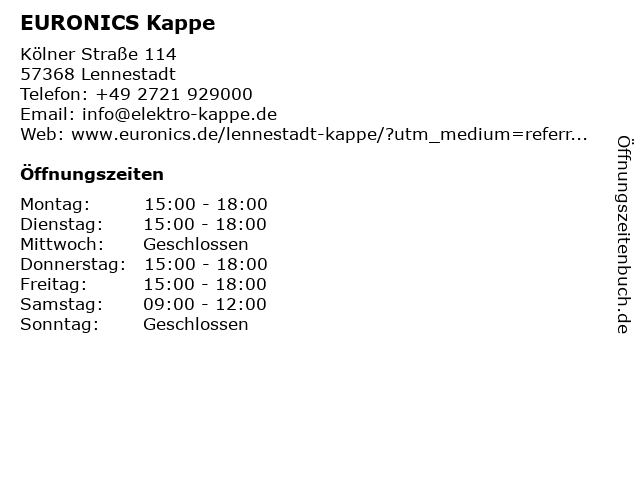 | Öffnungszeiten EURONICS Kappe in Lennestadt anzeigen | |