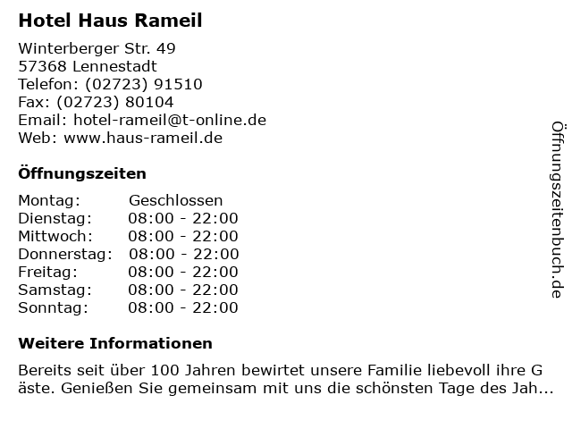 | Öffnungszeiten Hotel Haus Rameil in Lennestadt anzeigen | |