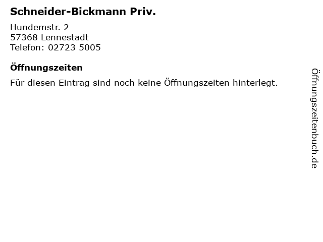 | Öffnungszeiten Schneider-Bickmann Priv. in Lennestadt anzeigen | |