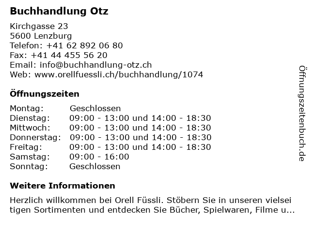 | Öffnungszeiten Buchhandlung Otz in Lenzburg anzeigen | |