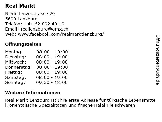 | Öffnungszeiten Real Markt in Lenzburg anzeigen | |