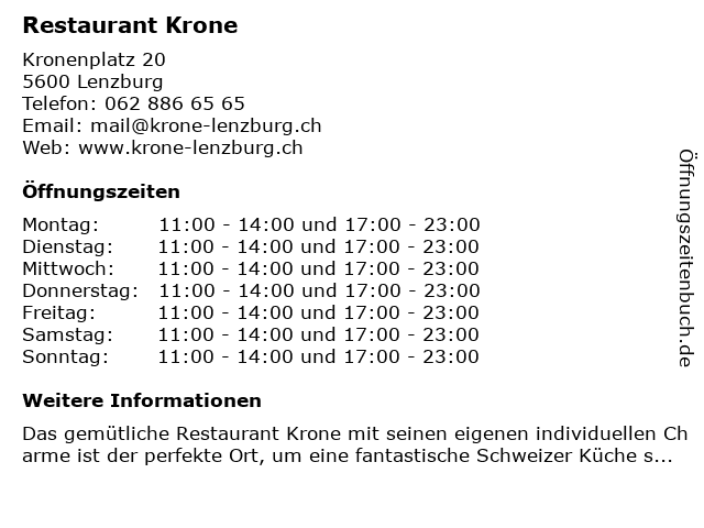 | Öffnungszeiten Restaurant Krone in Lenzburg anzeigen | |