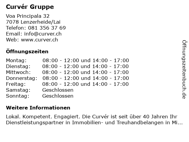 | Öffnungszeiten Curvér Gruppe in Lenzerheide/Lai anzeigen | |