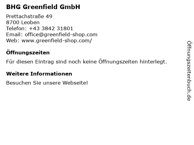 | Öffnungszeiten BHG Greenfield GmbH in Leoben anzeigen | |