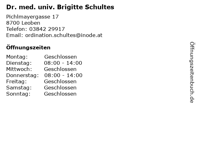 | 1 Dr. med. univ. et med. dent Astrid Joch - Zahnarztpraxis (Entfernung: 0,04 km) Pichlmayergasse 15, 8700 Leoben 4 Chirurgie Praxis Univ.Prof. Prim. Dr. Hans Rabl (Entfernung: 1,36 km) Peter-Tunner-Straße 4/1, 8700 Leoben 6 |