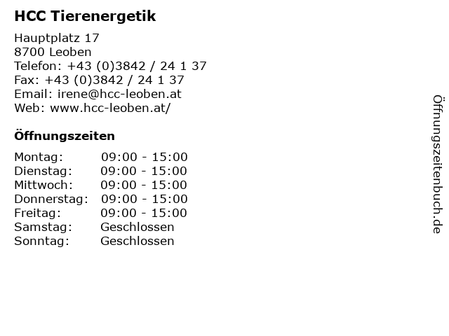 | Öffnungszeiten HCC Tierenergetik in Leoben anzeigen | |
