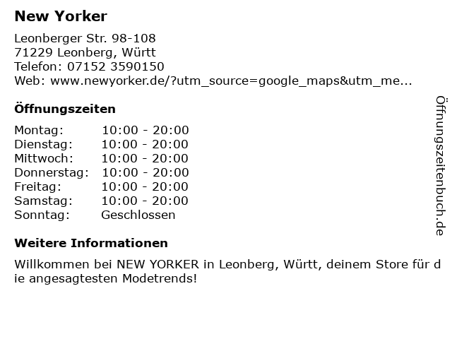 | Öffnungszeiten New Yorker in Leonberg, Württ anzeigen | |