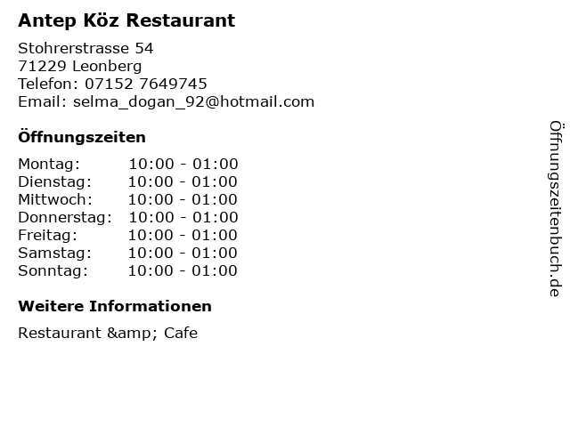 | Öffnungszeiten Antep Köz Restaurant in Leonberg anzeigen | |