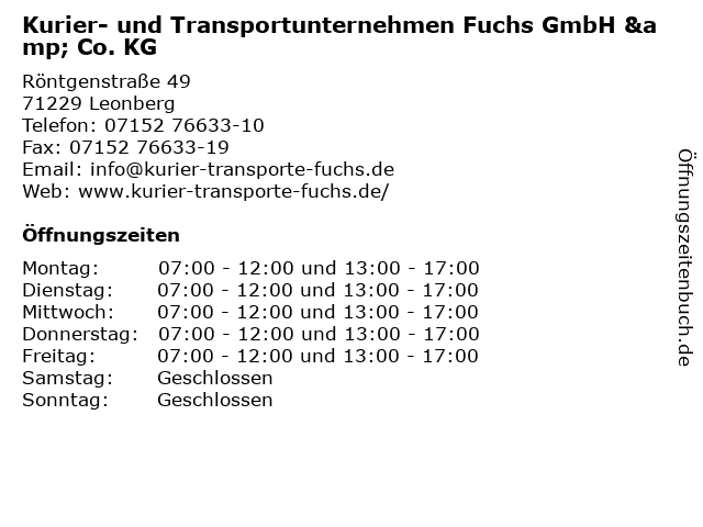 1 Manuel Fuchs Kurier- und Transportunternehmen (Entfernung: 0,43 km) Graf-Leutrum-Str. 33, 71229 Leonberg 2 Dr. Willi-Bernhard Fuchs, Dr. Yvonne Waibel, Dr. Michael Kaiser (Entfernung: 2,47 km) Lindenbergerstraße 10, 71229 Leonberg 6 |