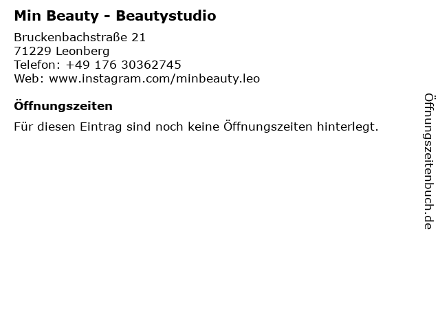 | Öffnungszeiten Min Beauty - Beautystudio in Leonberg anzeigen | |