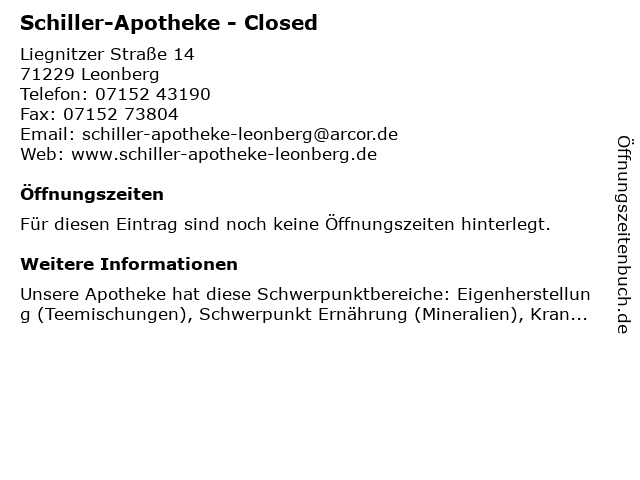 | Adresse Schiller-Apotheke - Closed in Leonberg anzeigen |