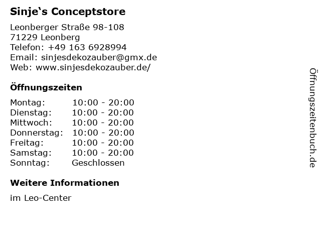 | Öffnungszeiten Sinje‘s Conceptstore in Leonberg anzeigen | |
