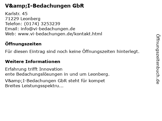 | Öffnungszeiten V&I-Bedachungen GbR in Leonberg anzeigen | |