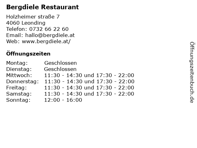 | Öffnungszeiten Bergdiele Restaurant in Leonding anzeigen | |