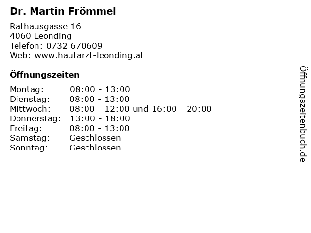 | Öffnungszeiten Dr. Martin Frömmel in Leonding anzeigen | |