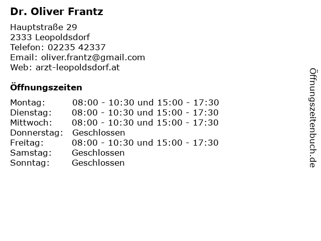 | Öffnungszeiten Dr. Oliver Frantz in Leopoldsdorf anzeigen | |
