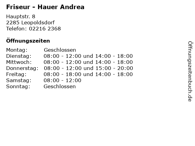 | Öffnungszeiten Friseur - Hauer Andrea in Leopoldsdorf anzeigen | |
