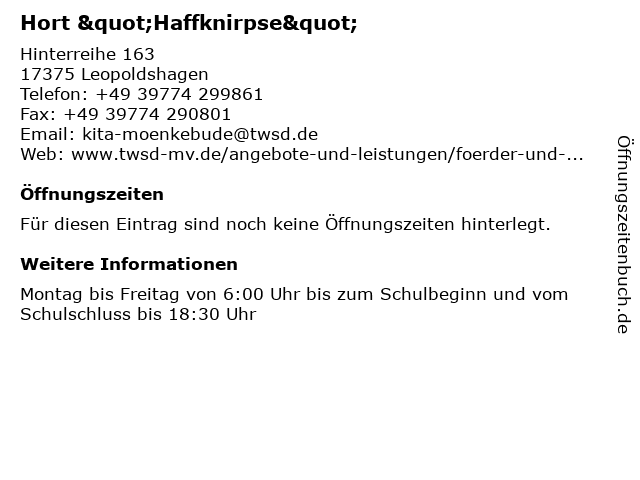 | Öffnungszeiten Hort "Haffknirpse" in Leopoldshagen anzeigen | |