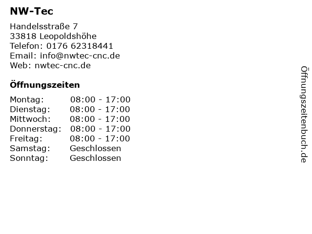 | Öffnungszeiten NW-Tec in Leopoldshöhe anzeigen | |