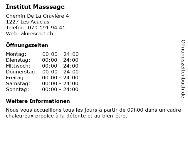 | Öffnungszeiten Institut Masssage in Les Acacias anzeigen | |