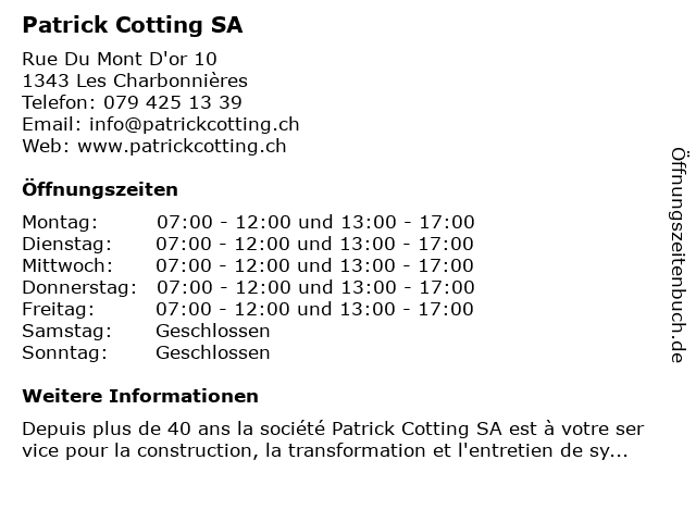 | Öffnungszeiten Patrick Cotting SA in Les Charbonnières anzeigen | |