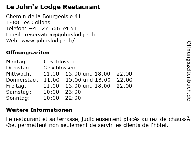 Branchen & Suchbegriffe zu Le John's Lodge Restaurant:ambiance chalet les collons, chalet de charme les collons, cuisine locale les collons, dîner romantique les collons, escapade culinaire les collons, gastronomie les collons, gastronomie valaisanne les collons, hôtel de charme les collons, hôtel-restaurant les collons, john's, john's lodge les collons, le, lodge, lodge 4 étoiles les collons, lodge les collons, repas gastronomique les collons, restaurant, restaurant de montagne les collons, restaurant gourmet les collons, restaurant les collons, restaurant panoramique les collons, séjour ski les collons, vins suisses les collons |