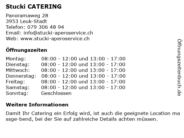 | Öffnungszeiten Stucki CATERING in Leuk-Stadt anzeigen | |