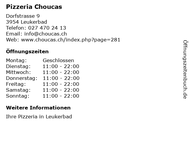 | Öffnungszeiten Pizzeria Choucas in Leukerbad anzeigen | |