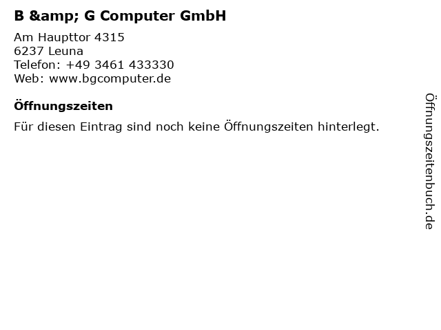 | Öffnungszeiten B & G Computer GmbH in Leuna anzeigen | |