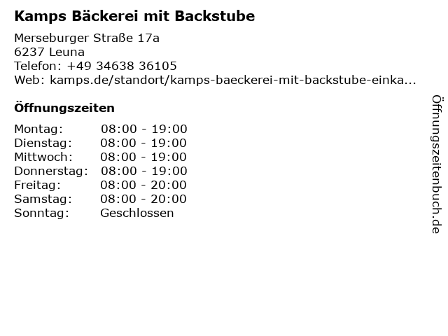 | Öffnungszeiten Kamps Bäckerei mit Backstube in Leuna anzeigen | |
