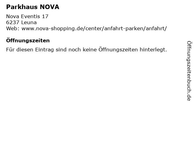 | Öffnungszeiten Parkhaus NOVA in Leuna anzeigen | |