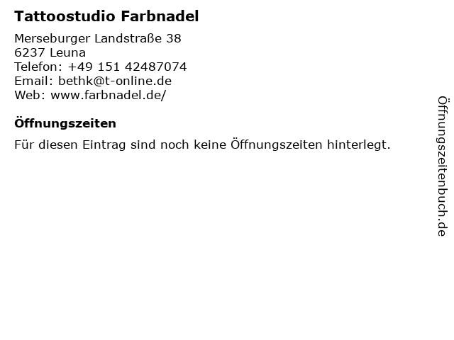 | Öffnungszeiten Tattoostudio Farbnadel in Leuna anzeigen | |