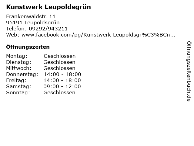 | Öffnungszeiten Kunstwerk Leupoldsgrün in Leupoldsgrün anzeigen | |