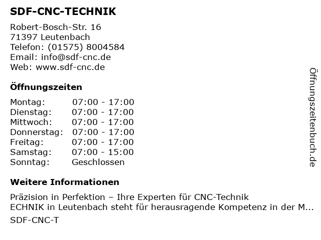 | Öffnungszeiten SDF-CNC-TECHNIK in Leutenbach anzeigen | |
