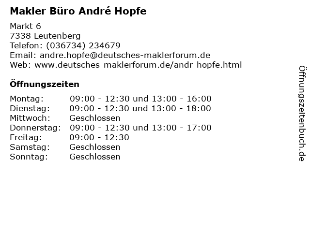 | Öffnungszeiten Makler Büro André Hopfe in Leutenberg anzeigen | |