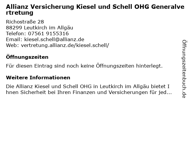 | Allianz Versicherung Kiesel und Schell OHG Generalvertretung anrufen | |