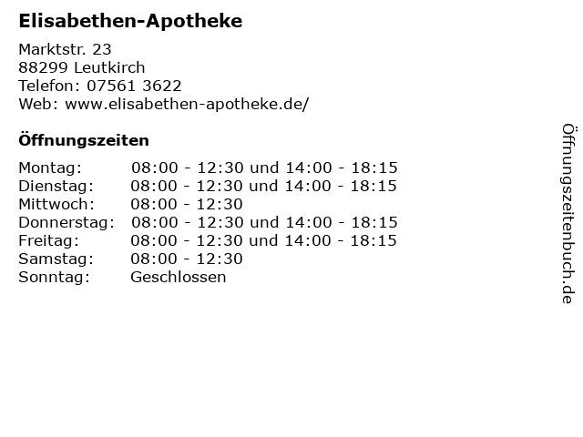 | Öffnungszeiten Elisabethen-Apotheke in Leutkirch anzeigen | |