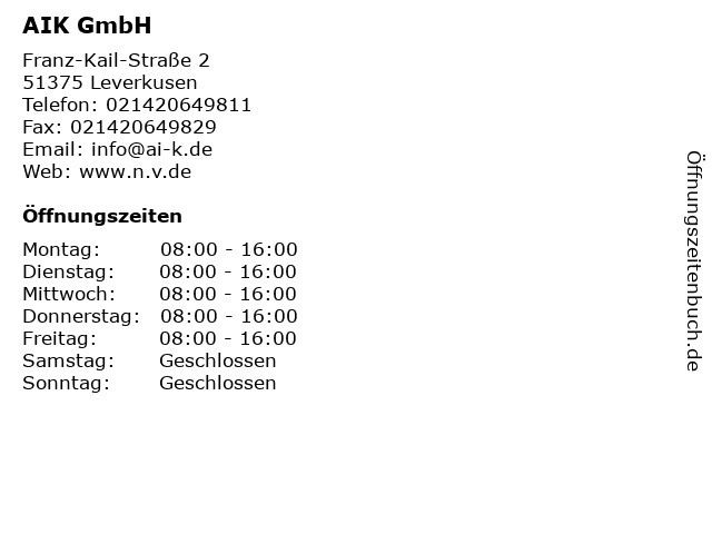| Öffnungszeiten AIK GmbH in Leverkusen anzeigen | |