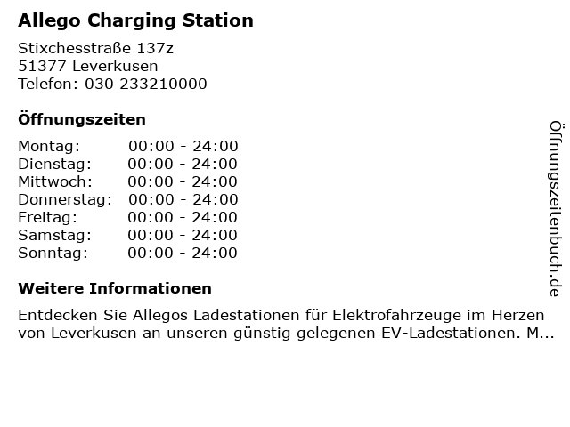 | Öffnungszeiten Allego Charging Station in Leverkusen anzeigen | |