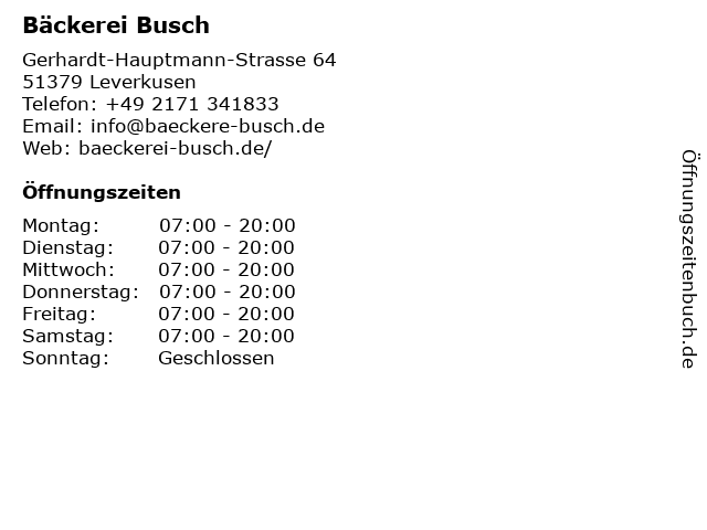 | Öffnungszeiten Bäckerei Busch in Leverkusen anzeigen | |