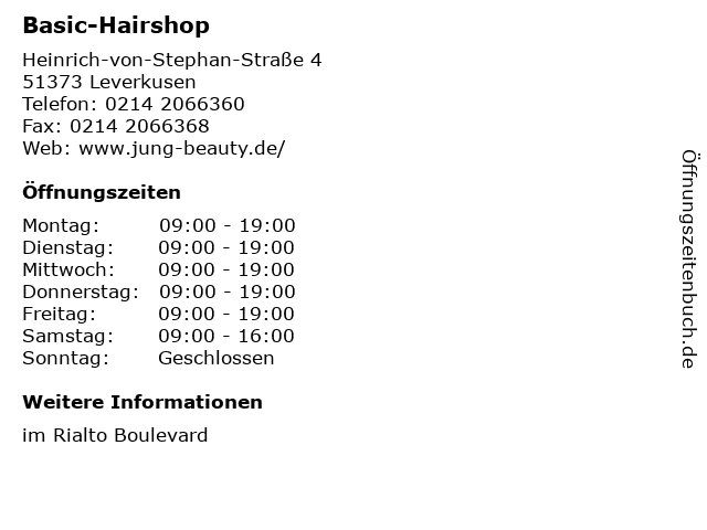 | Öffnungszeiten Basic-Hairshop in Leverkusen anzeigen | |