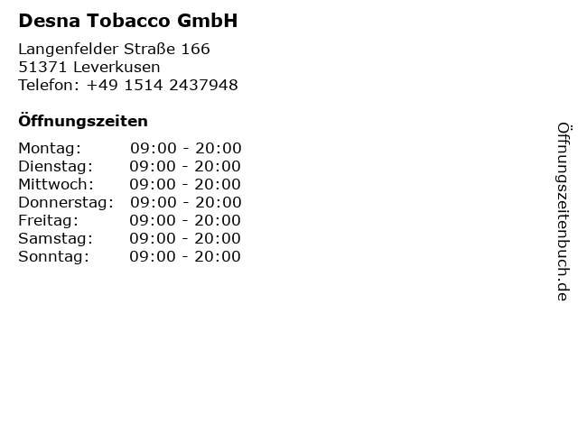 Öffnungszeiten Desna Tobacco GmbH in Leverkusen anzeigen | |