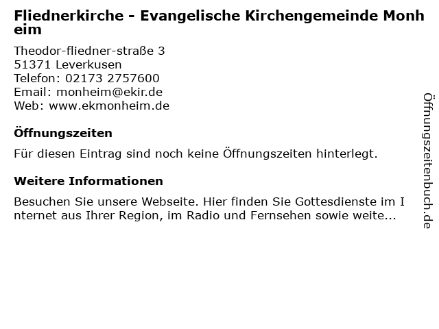 | Fliednerkirche - Evangelische Kirchengemeinde Monheim anrufen | |