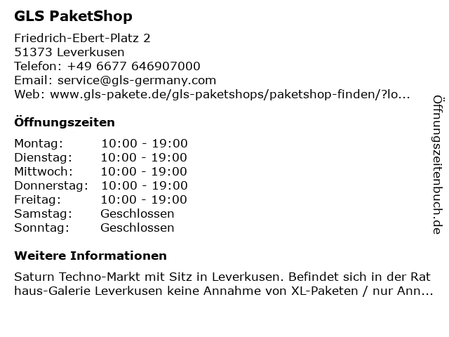 | Öffnungszeiten GLS PaketShop in Leverkusen anzeigen | |