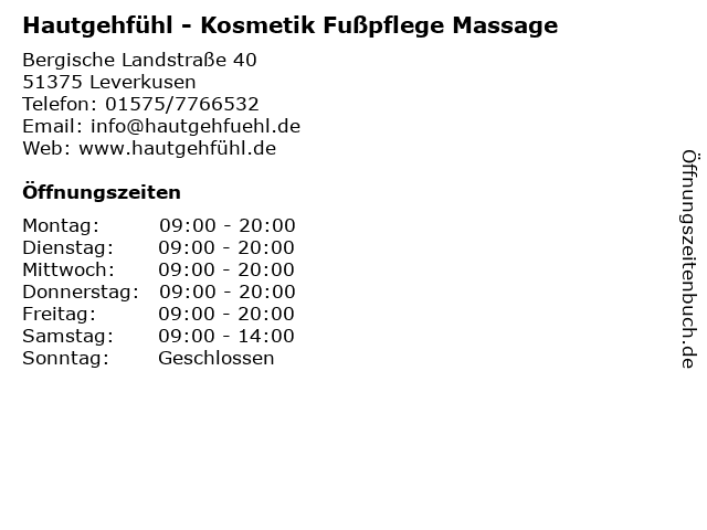 3 Sabine Weiske Kosmetikinstitut Medizinische Fußpflege (Entfernung: 0,17 km) Münsters Gäßchen 16, 51375 Leverkusen 4 Petra Ciszewski Kosmetik und Medizinische Fußpflege (Entfernung: 0,24 km) Von-Diergardt-Str. 3, 51375 Leverkusen 6 |
