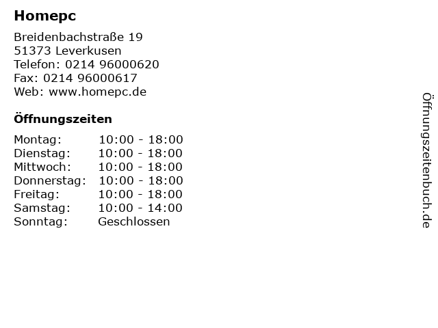 | Öffnungszeiten Homepc in Leverkusen anzeigen | |