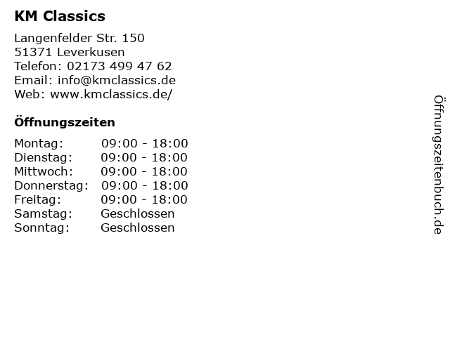 | Öffnungszeiten KM Classics in Leverkusen anzeigen | |